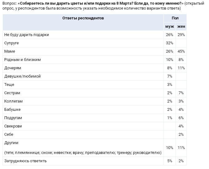 Мужчины будут поздравлять с 8 Марта своих жён, матерей и дочерей. Каждый десятый мужчина готовит презенты всем знакомым дамам, некоторые мужчины приготовили сюрприз для своей девушки. Только 3% мужчин поздравят тёщу, ещё меньше — сестер, коллег и бабушек. Большинство женщин будут поздравлять с 8 Марта своих матерей и дочерей. Чаще мужчин женщины поздравляют сестер и подруг.