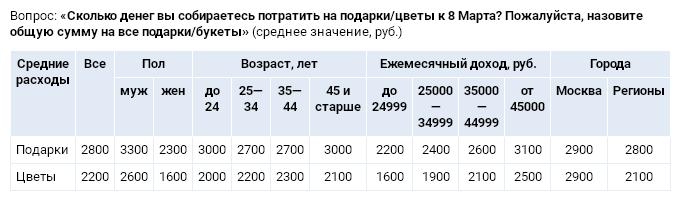 8 Марта — праздник более затратный, чем 23 февраля. Средний бюджет на подарки к Женскому дню составляет 2800 руб. Кто-то будет дарить только цветы, кто-то и букет, и подарок. На цветы россияне планируют потратить около 2200 руб. Не будут покупать цветы и подарки к 8 Марта 26% мужчин и 29% женщин. Молодежь до 24 лет и россияне старше 45 потратят на подарки чуть больше респондентов других возрастов.