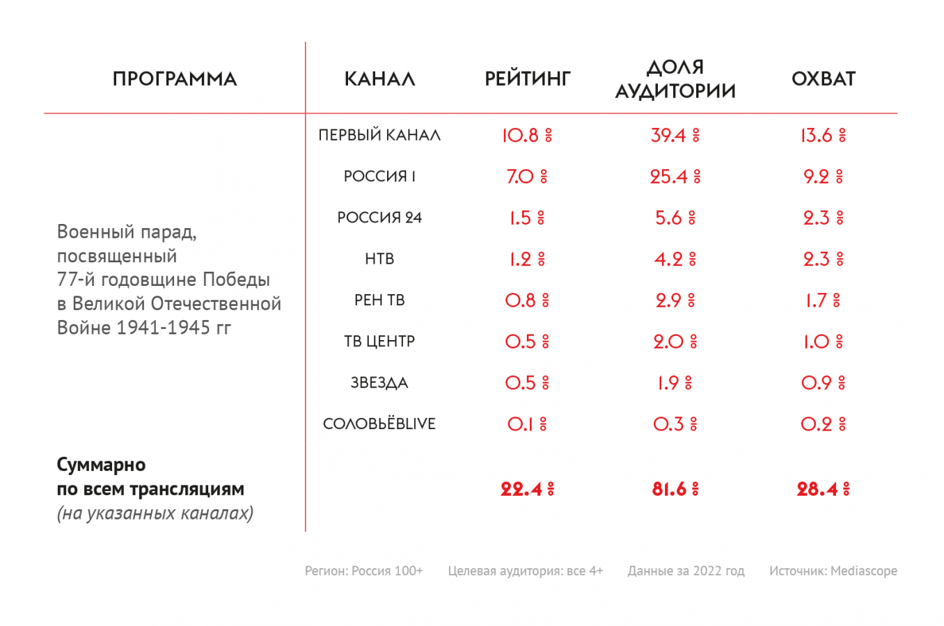 В 2022-м парад Победы посмотрели 81,6% телезрителей городов с населением более 100 тыс. человек старше 4 лет, что на 6,2% больше, чем в 2021 году, подсчитали в Mediascope. Охват парада Победы — количество человек, смотревших телепрограмму минимум 1 минуту — составил 28,4%, а рейтинг передачи — среднее количество человек, смотревших телепрограмму, — достиг отметки в 22,4%.