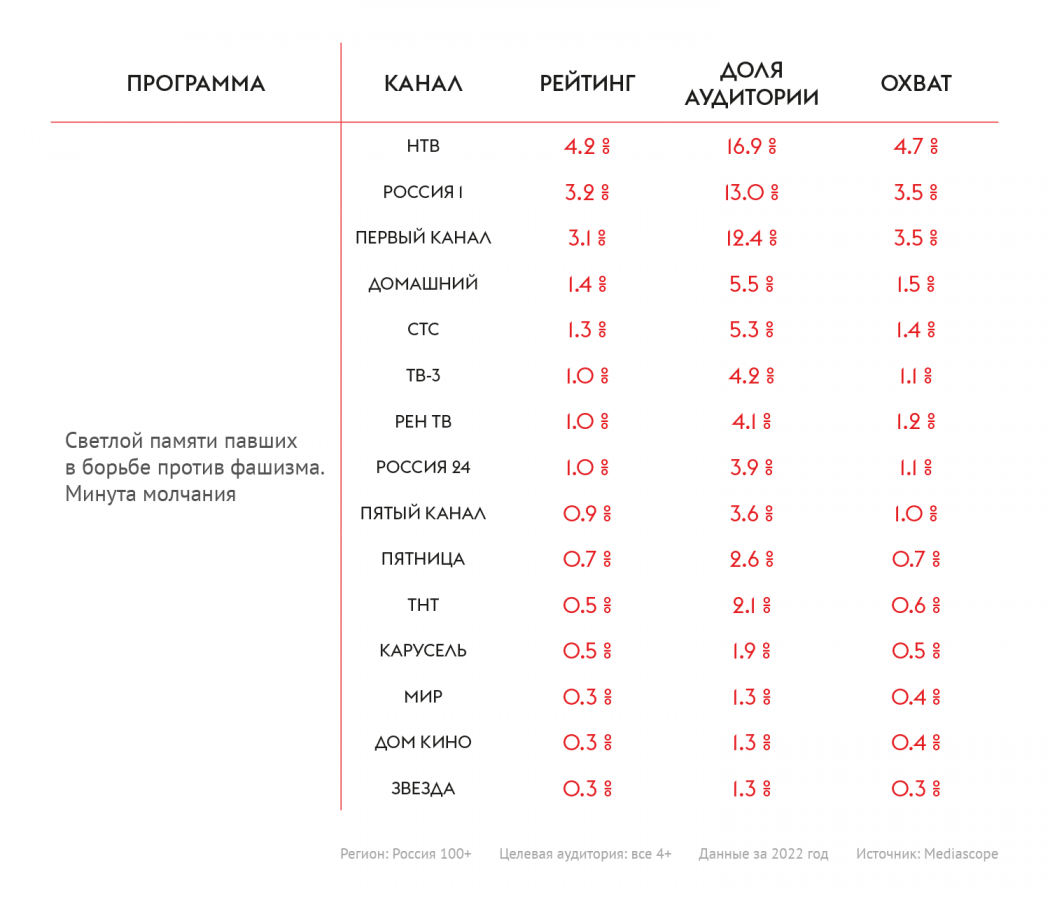 Увеличилось и количество телезрителей «Минуты молчания», которая транслируется в вечернее время. В этом году её посмотрели 87,7% телезрителей крупных городов России. Здесь тройку лидеров возглавил НТВ с долей аудитории в 16,9%, следом — «Россия 1» (3,2%) и «Первый канал» (3.1%).