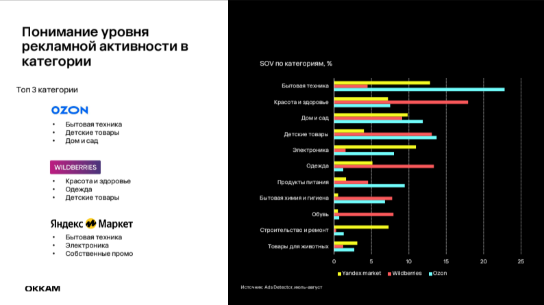 К топовым категориям всех маркетплейсов относятся бытовая техника и детские товары. Но на Wildberries лидирует красота и здоровье.