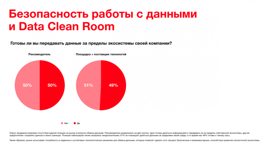 Опрос также продемонстрировал отсутствие единой позиции на рынке в вопросе обмена данными. Участники разделились на две группы: одни готовы делиться информацией и передавать ее за пределы собственной экосистемы, другие предпочитают сохранять данные в своих границах. Рынок испытывает потребность в надежных и устойчивых технологических решениях для обмена данными, которые позволят сделать этот процесс безопасным и взаимовыгодным.