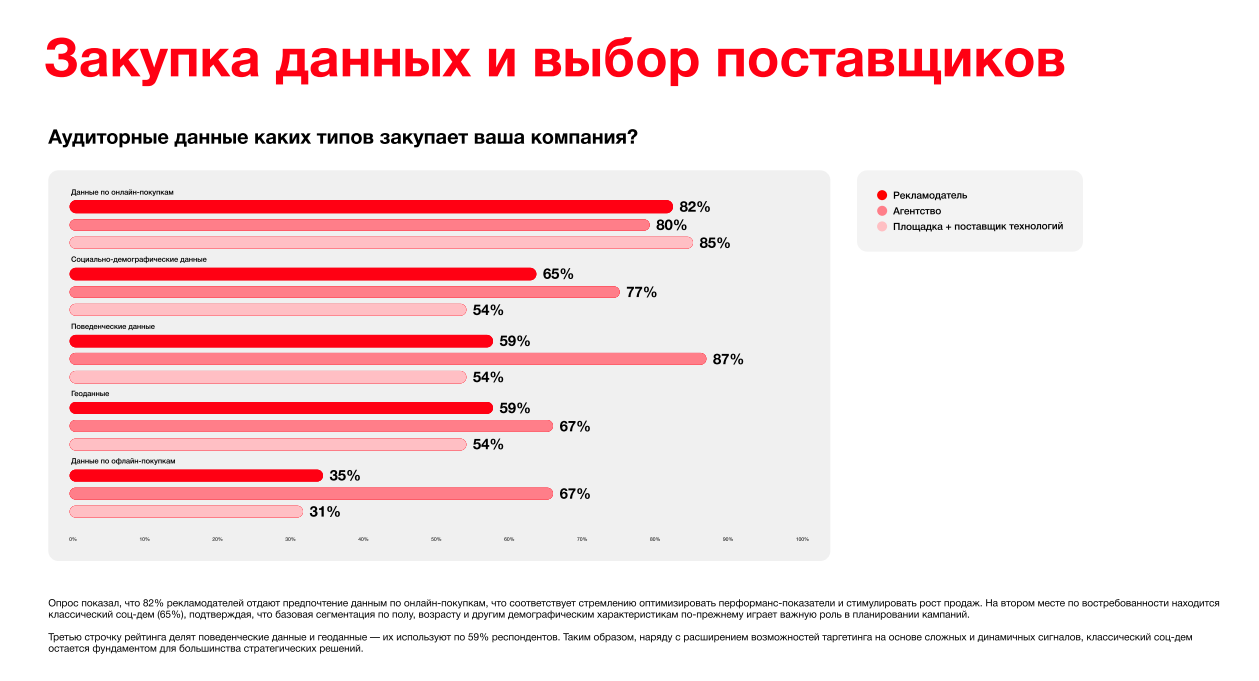 Наибольшая часть рекламодателей (82%) и площадок (85%) закупают данные по онлайн-покупкам аудитории, на втором месте у них приобретение социально-демографических данных (65% и 54% соответственно), на третьем — поведенческие и геоданные (59% и по 54% соответственно). «Портфель» данных у агентств отличается: 87% отдают предпочтение поведенческим данным, 80% — данным по онлайн-покупкам, 77% — социально-демографическим данным.