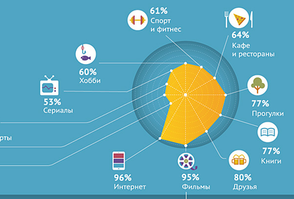 Равной популярностью пользуются прогулки и чтение книг — так расслабляются 77% пользователей проекта. 80% респондентов на досуге встречаются с друзьями. Первые места по популярности заняли досуг в интернете (96%) и просмотр фильмов (95%).