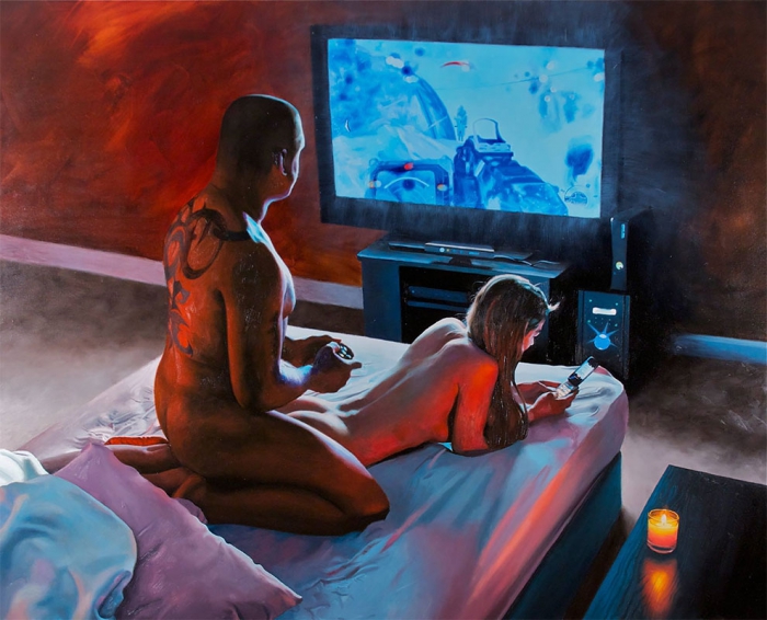 Современный художник Джон Джексон выпустил серию картин в которых гаглядно показал одержимость людей технологиями, а также то, как компьютеры, смартфоны, интернет и т.д. вторгаются во все аспекты нашей личной жизни.