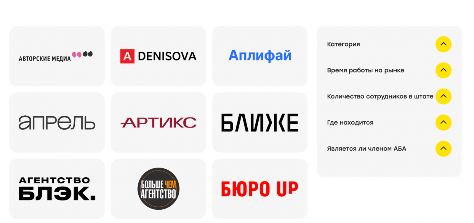 Карта отражает экосистему инфлюенс-маркетинга в России и позволяет игрокам рынка в интерактивном формате найти партнеров с нужной специализацией. На главной странице все заявленные компании представлены в алфавитном порядке. Справа от логотипов размещен фильтр с ключевыми характеристиками: