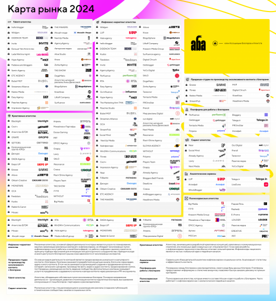 Ассоциация блогеров и агентств (АБА) представила обновленную карту рынка инфлюенс-маркетинга, в которую вошли 113 ключевых агентств, студий, платформ и сервисов. Об этом Sostav рассказали в пресс-службе объединения.