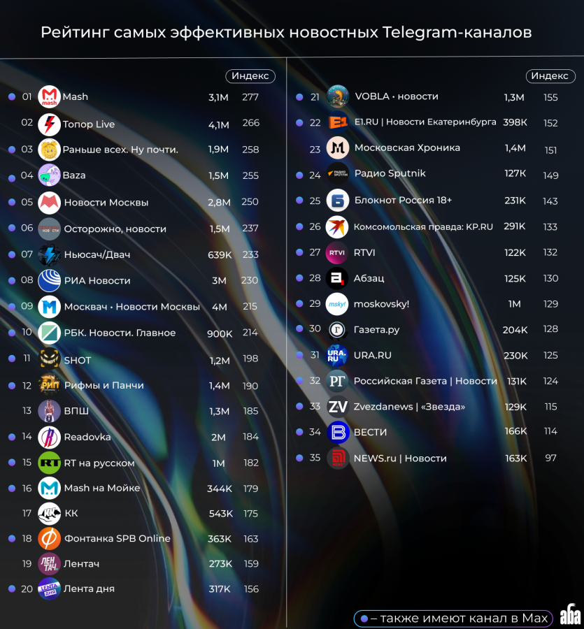 Отдельно анализировалось присутствие каналов в мессенджере «Макс». По данным АБА, у большинства участников рейтинга есть «зеркала» на этой платформе, при этом их аудитория составляет от 15% до 60% от Telegram-версий. Пик переходов пришелся на февраль 2026 года.