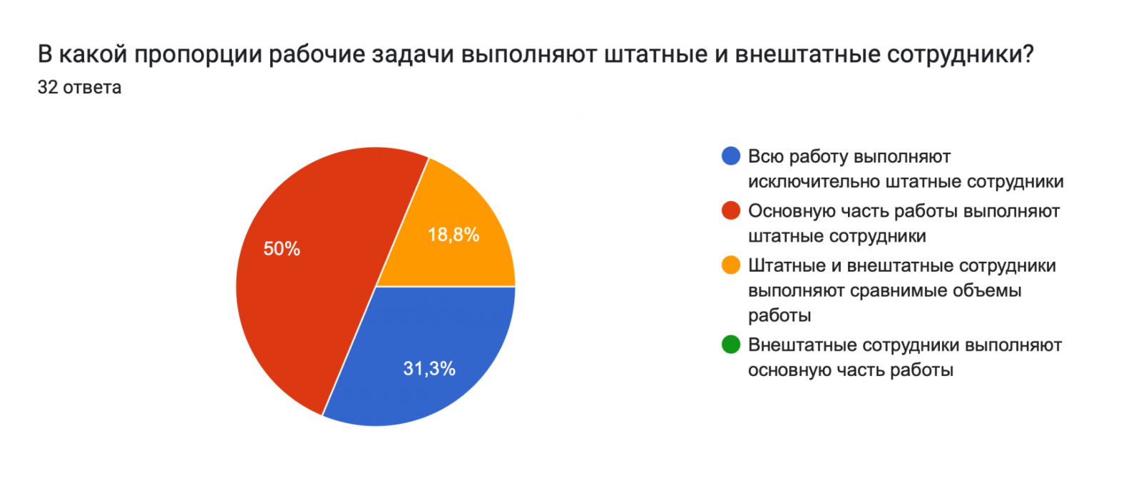 В половине агентств регулярно прибегают к внештатному труду, в 18,8% компаний внештатники работают наравне с основной командой. В 31,3% агентств используется исключительно труд штатных сотрудников. На аутсорс чаще всего отдают работы в направлениях продакшен (50%), техподдержка (34,4%) и скаутинг (21,9%).