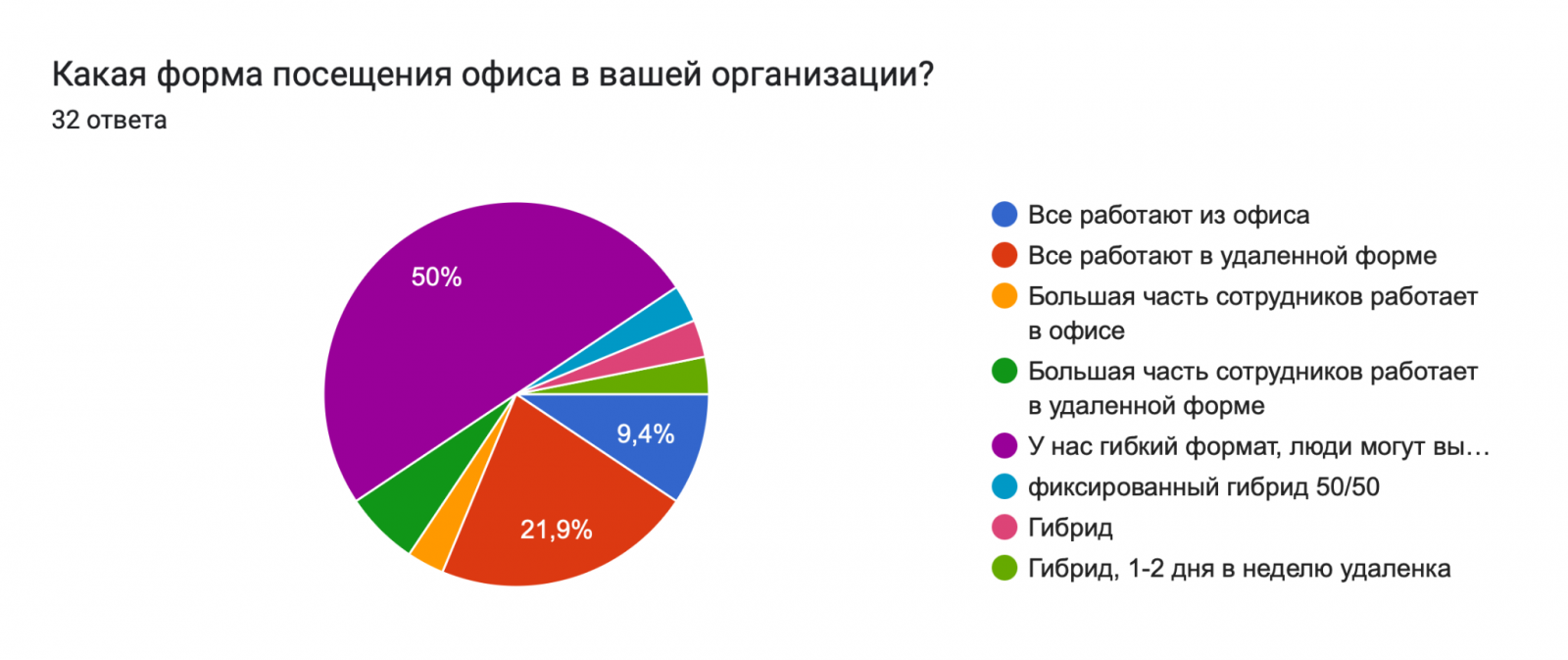 Пятая часть (21,9%) участников АБА предпочитает удалёнку. В 2022−2023 годах показатель достигал трети. Также стало меньше чисто «офисного» формата: в опенспейсах работают 9,4% сотрудников против 16% в предыдущем периоде исследования.