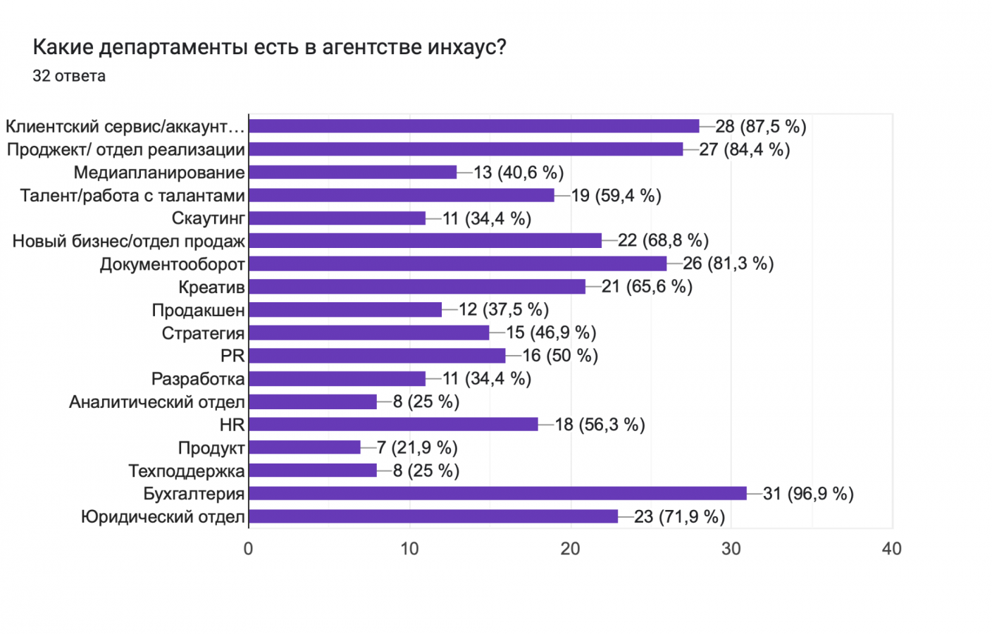 В 2022−2023 годах 45% опрошенных планировали открывать полностью новые направления и отделы, в этом году такие намерения выразили 6,7% агентств. В большинстве компаний (87,5%) есть отделы клиентского сервиса и реализации. В 71,9% агентств работает юридическая команда, в 81,3% — бухгалтерия и штатный отдел документооборота.