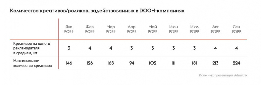 По словам Фролова, новая статистика на основе мониторинга 100% эфира цифровых рекламных конструкций позволяет получить «эфирную справку» о размещении в outdoor, а также «иметь детальную картину о размещении конкурентов». По данным AdMetrix, в сентябре в среднем на одного рекламодателя приходилось четыре креатива, их максимальное количество в DOOH-кампаниях составило 224.