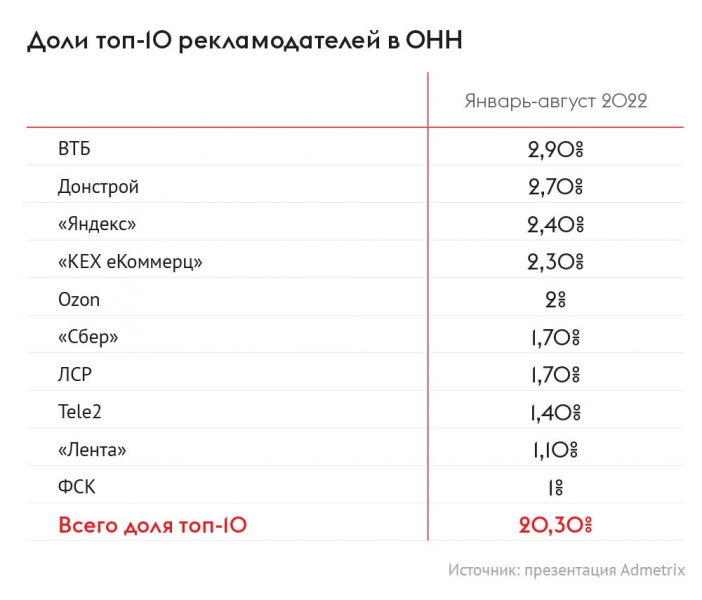 Как отметил Фролов, за прошедший год в топ-10 рекламодателей OOH произошли изменения: пять компаний покинули список, общая доля затрат вошедших в десятку организаций выросла на два пункта — с 17,9% до 20,3%. На первом месте раположился ВТБ (2,9%), на втором — «Донстрой» (2,7%), тройку замыкает «Яндекс» (2,4%).