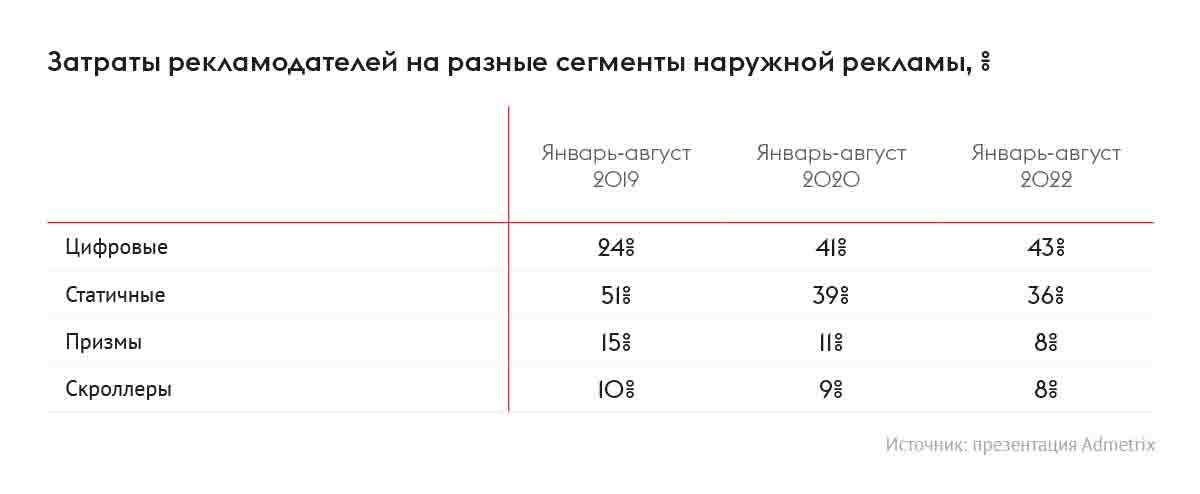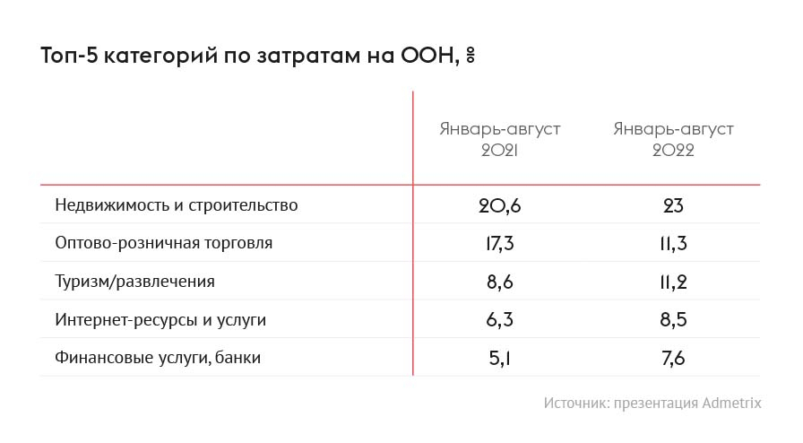 По данным Admetrix, в 2022 году доля общих затрат на OOH растёт у четырёх категорий. Возглавляет топ-5 «Недвижимость и строительство» (23%). Доля категории «Оптово-розничная торговля» снизилась до 11,3% против 17,3% в 2021 году.