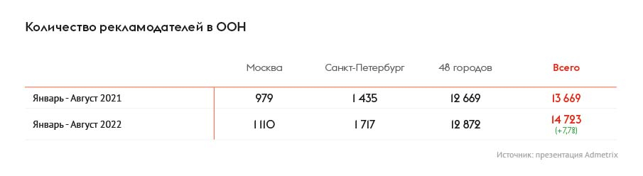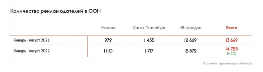 Спикер подчеркнул, что несмотря на кризисные явления в экономике и санкции, количество рекламодателей в OOH с января по август выросло почти на 8%, до 14,7 тыс., в 50 российских городах, включая Москву и Санкт-Петербург.