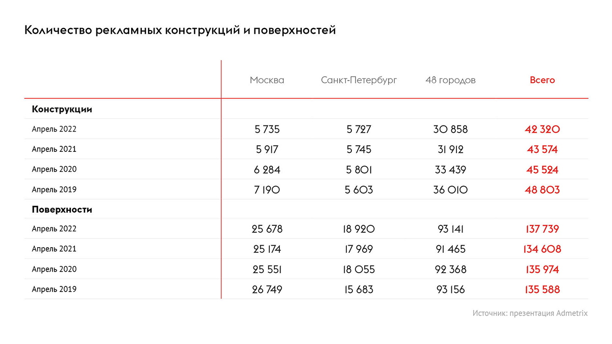 Количество рекламных конструкций стремительно сокращается из года в год, при этом ёмкость рынка в рекламных поверхностях сохраняется, отметил спикер. Согласно подсчётам AdMetrix, в апреле 2022 года количество рекламных конструкций составило 42,3 тыс., поверхностей — 137,7 тыс., в 2019 году: конструкций — 48,8 тыс., поверхностей — 135,6 тыс.