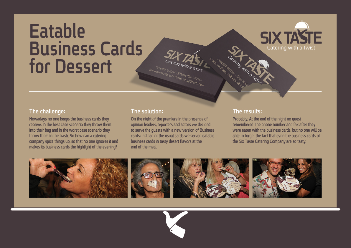 Израильское креативное агентство Addict-tiltan создало съедобные визитные карточки для кейтеринговой компании Six Taste.
