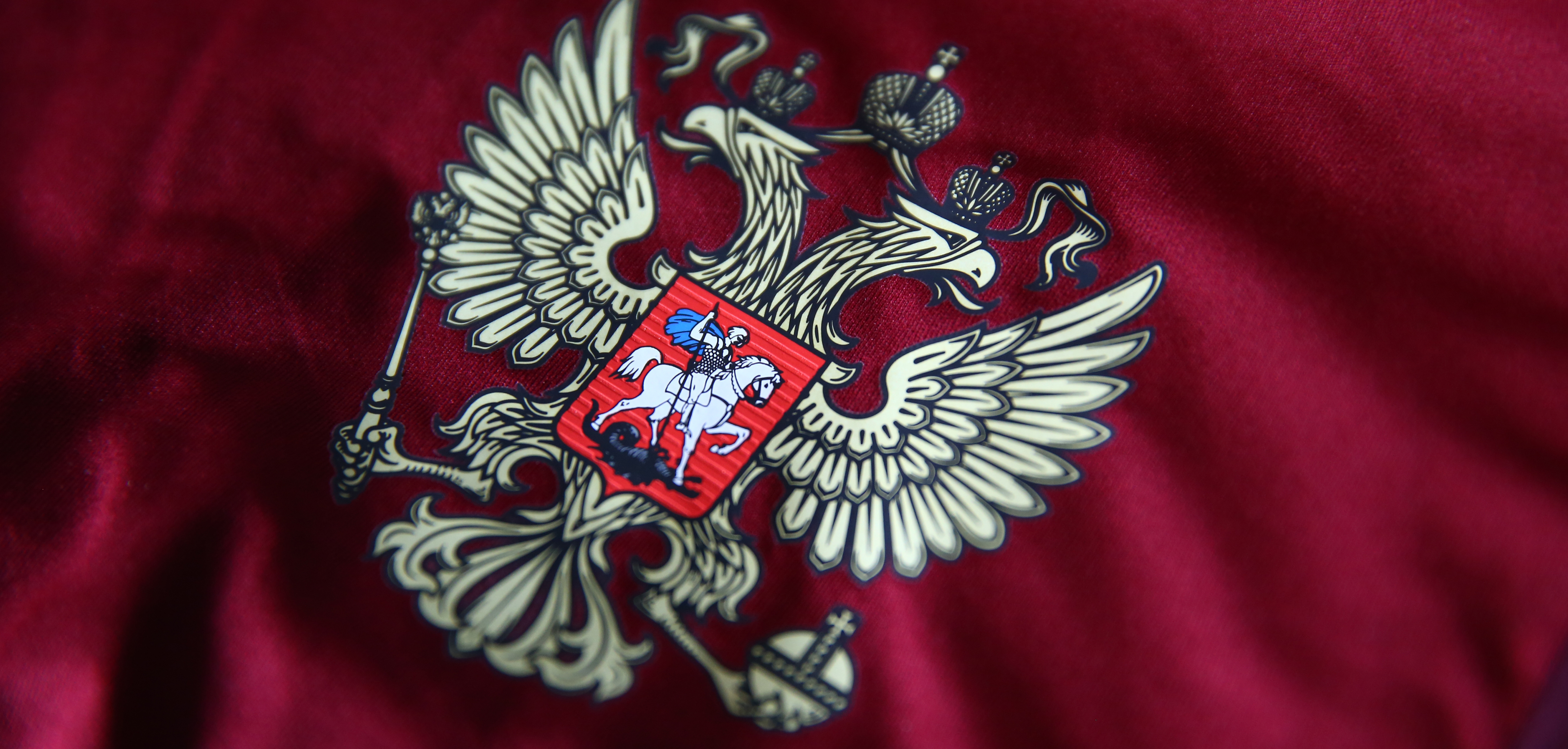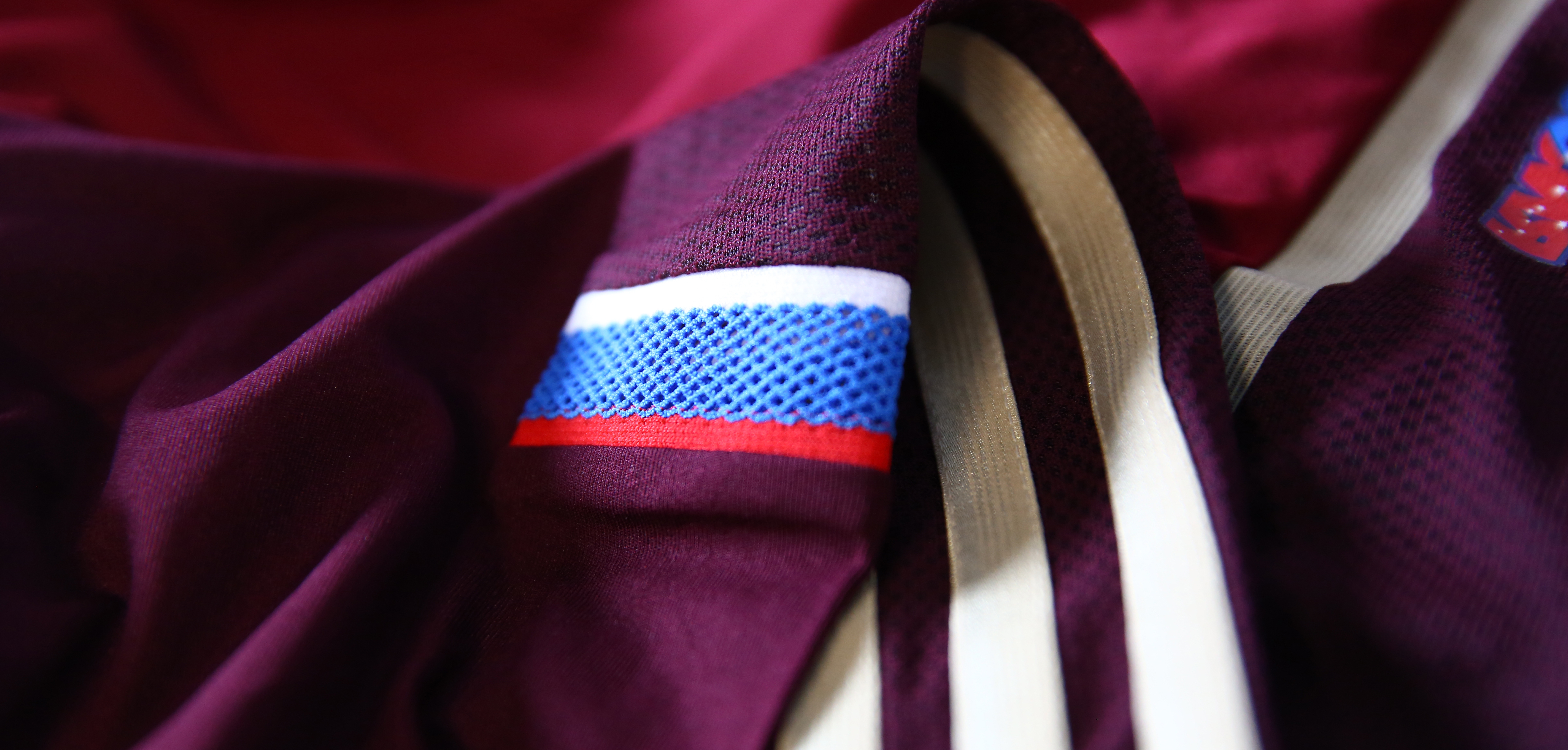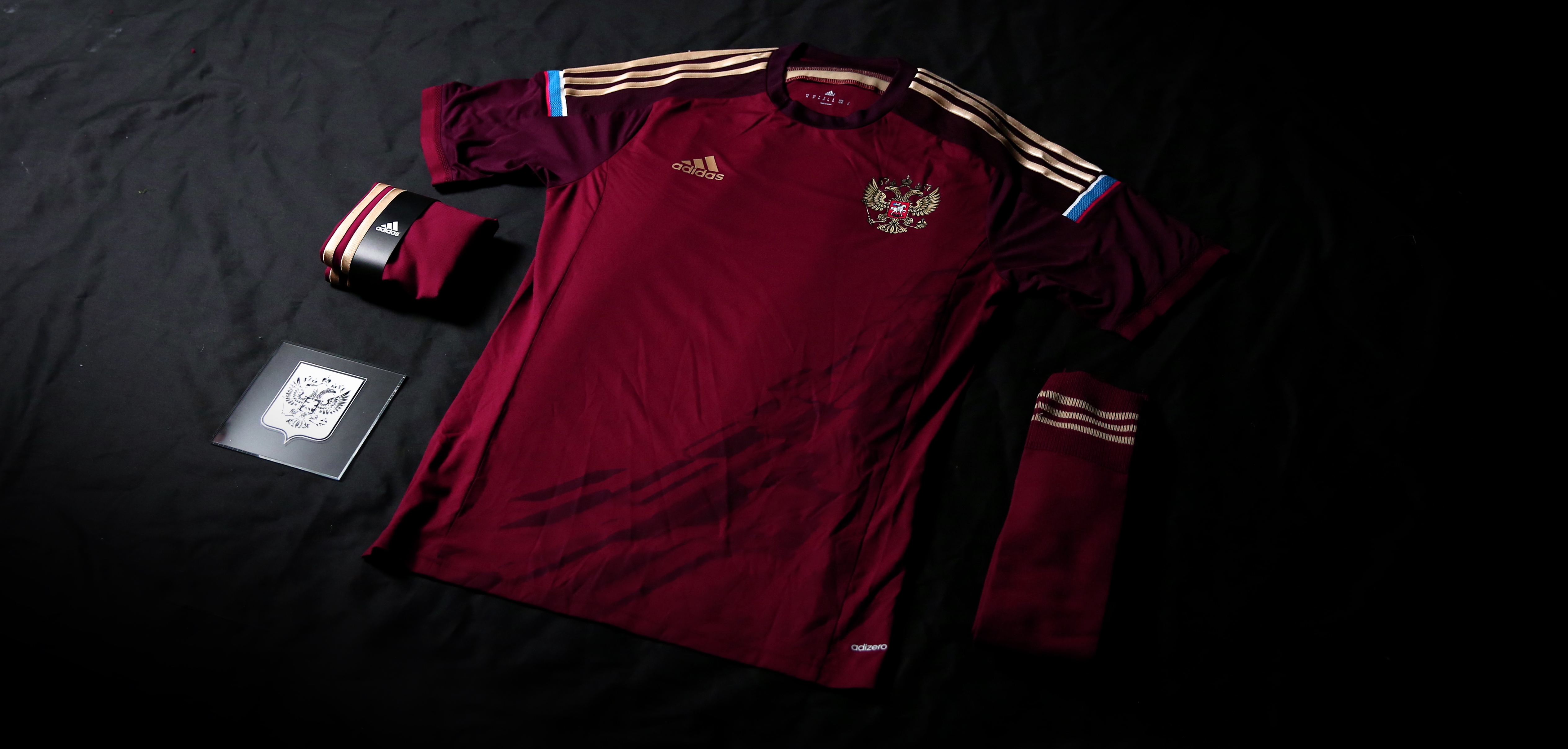 Экипировка отличается оригинальными деталями: принтом с изображением стелы «Покорителям космоса», тремя золотыми полосками adidas и флагом России. Цвет экипировки называется «кардинал». Сочетание золота с бордовым символизирует царские регалии. Футболки и шорты формы украшены золотистым двуглавым орлом. Экипировка сделана из копрессионных и стретчивых воздухопроницаемых материалов. Маркетинговые продукты будут доступны всем болельщикам.