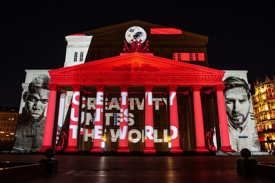 adidas накануне официального старта Чемпионата мира по футболу FIFA 2018 в России подсветил фасад Большого театра серией уникальных проекций о футболе и креативности в игре.