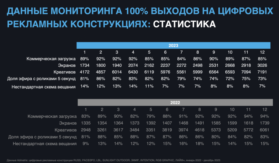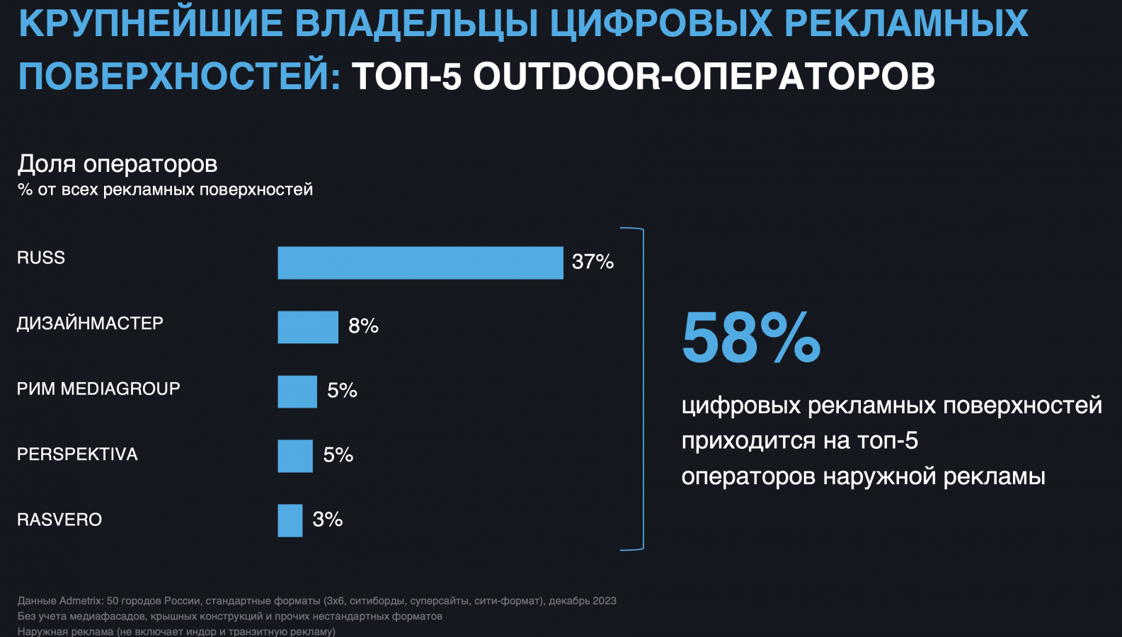 Как отмечают в Admetrix, крупнейшие игроки на рынке цифровой наружной рекламы — Russ, «Дизайнмастер», медиагруппа «РИМ», «Перспектива» и «РАСВЭРО». В сумме на топ-5 диджитал-операторов ООН приходится 58% цифровых рекламных поверхностей. Остальная часть рынка по-прежнему фрагментирована, что усиливает потребность в стандартизации, подчёркивают в измерителе.