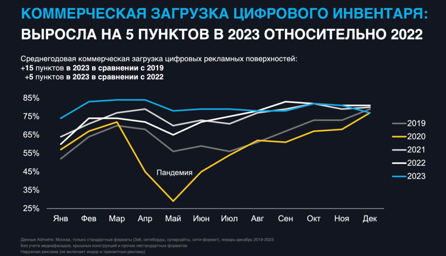 В 2023 году средняя коммерческая загрузка цифрового инвентаря увеличилась на пять пунктов по отношению к 2022 году. Показатель демонстрирует наивысшие значения за последние пять лет, говорится в исследовании.