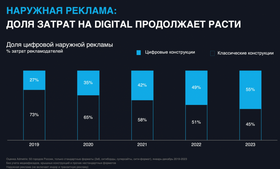 Доля затрат на диджитал в наружной рекламе продолжает расти. Впервые на цифровой формат пришлось более половины (55%) всего объёма вложений в OOH, отмечает измеритель.