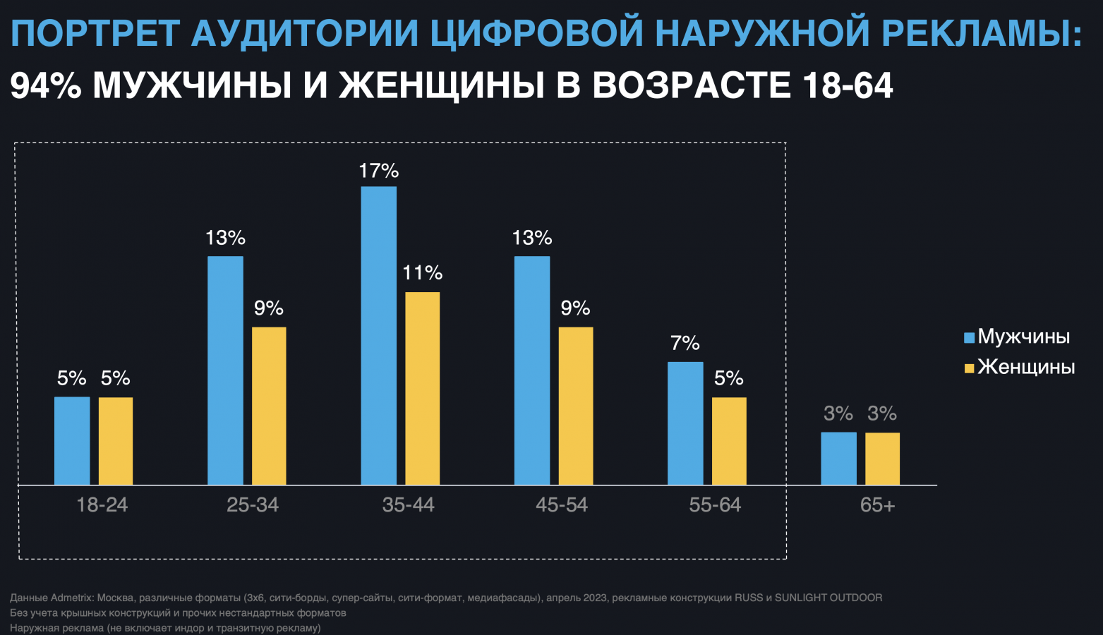 94% аудитории наружной рекламы составляют мужчины и женщины в возрасте от 18 до 64 лет.