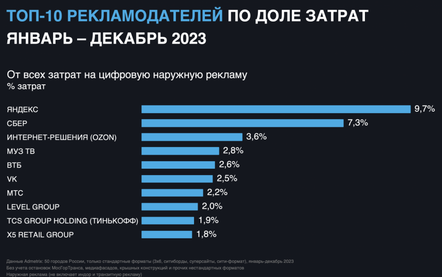 В 2023 году крупнейшим рекламодателем сегмента оказался «Яндекс», доля которого составляет чуть меньше 10% от всех затрат на цифровую наружную рекламу. В первую пятёрку также вошли «Сбер», Ozon, «Mуз-ТВ» и ВТБ.