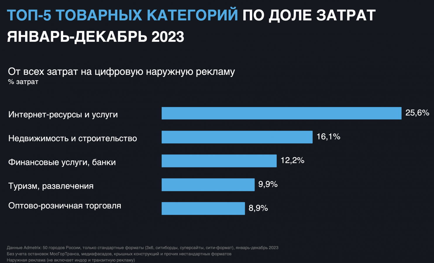 Согласно данным Admetrix, крупнейшая товарная категория в цифровой наружной рекламе в 2023 году — интернет-ресурсы и услуги. На неё приходится четверть всех затрат. Также в топ-5 входят недвижимость и строительство, финансовые услуги и банки, туризм и развлечения, оптово-розничная торговля.