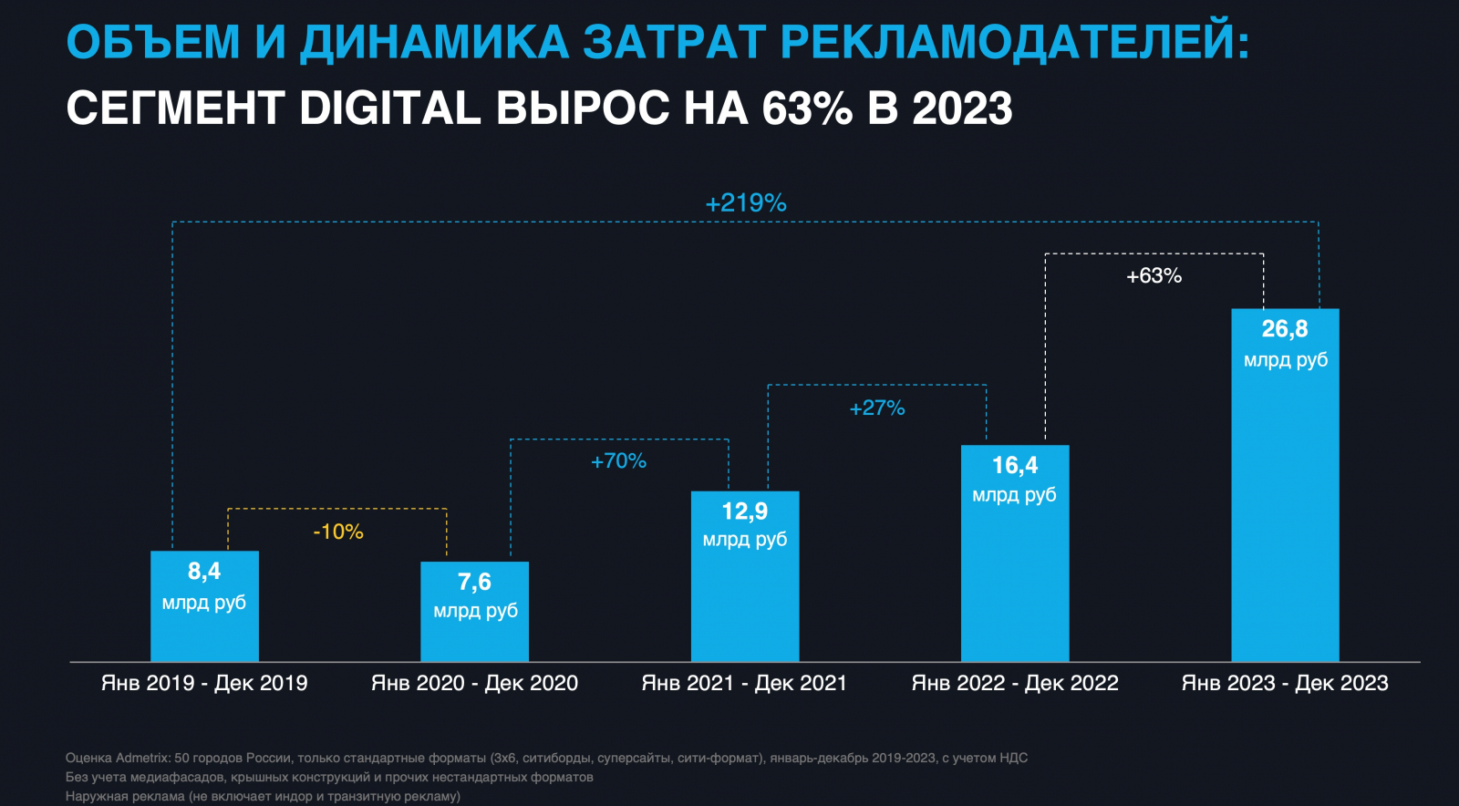 Объём сегмента цифровой наружной рекламы в России вырос на 219% в 2023-м по сравнению с 2019 годом. Затраты рекламодателей на DOOH-сегмент в прошлом году составили 26,8 млрд руб., что на 63% выше, чем в 2022 году. Такие данные приводит индустриальный измеритель OOH-рынка