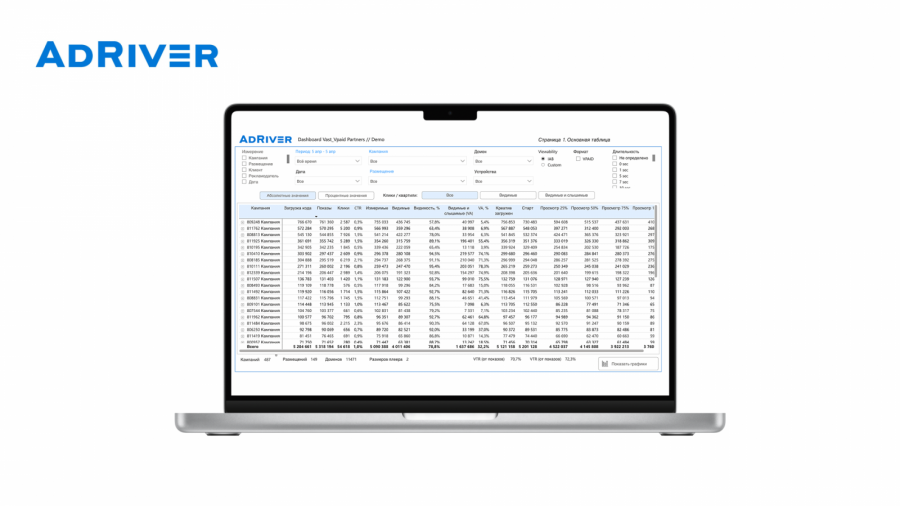 Аналитика в разрезе каждой кампании доступна в едином окне. Среди показателей эффективности видеорекламы: показы, клики, CTR, видимость и другие метрики. Для оценки результатов промо новый инструмент соотносит целевые события с конкретными роликами, местами размещения и другими параметрами, доступными для детализации в AdRiver. Перед использованием инструмента необходимо установить на сайт код AdRiver.