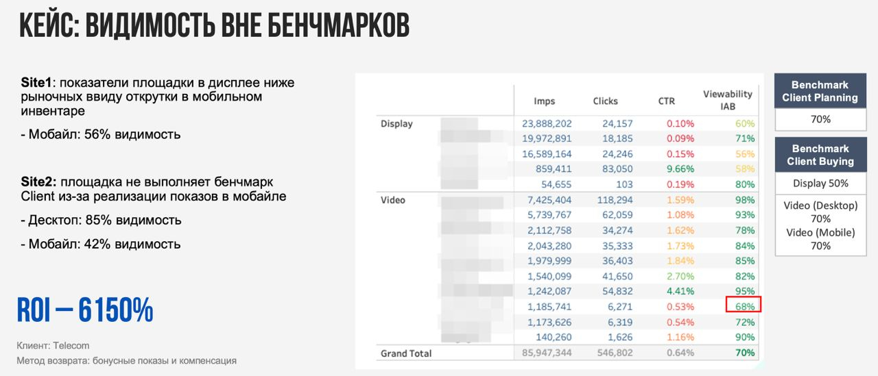 «Работа по коду позволяет получать значительный сейвинг в медиаинвестициях. Например, в течение трёх лет нашим специалистам удалось повысить видимость для телеком-клиента с 30% до 77% по баннерам, а по видео — с 60% до 92%. Рост видимых показов привел к росту кликов и визитов на сайте и всех последующих метрик по воронке, что напрямую повлияло на бизнес-показатели», — поделилась команда Adserving.