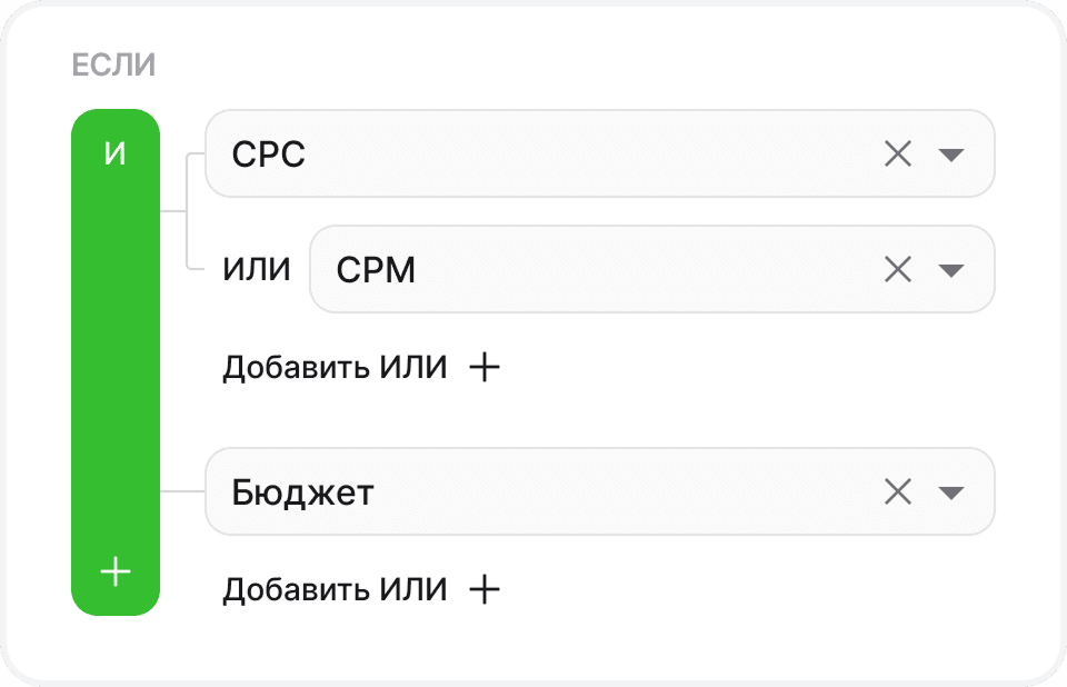 В «Стратегии 2.0» увеличено количество отслеживаемых параметров. Система позволяет задавать условия по 10 основным метрикам, включая CPA, CTR, CR, CPC и расходы.