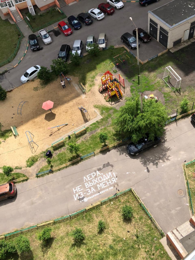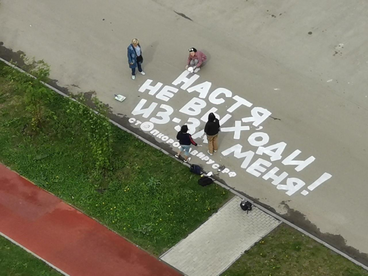 Кампания «Не выходи из-за меня», вдохновленная актом предложения руки и сердца, призвана напомнить гражданам о важности заключительных недель обязательного режима самоизоляции, который продолжает действовать в большинстве регионов России. В 15 городах, где сохраняется режим самоизоляции, стрит-арт художники нанесли на асфальте в спальных районах граффити с фразой «Аня/Лера/Оля, не выходи из-за меня!» и указанием сайта стопкоронавирус.рф.