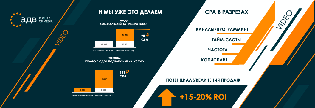 На конференции АДВ Future of Media Игорь Перевозчиков, генеральный директор АДВ Лаб, поделился подробностями совместного проекта. Можно сравнить, как соотносятся продажи среди людей, которые видели и не видели рекламу на примере FMCG и Телекома. По словам Перевозчикова, такой анализ позволит увеличить ROI телевидения на 15−20%.
