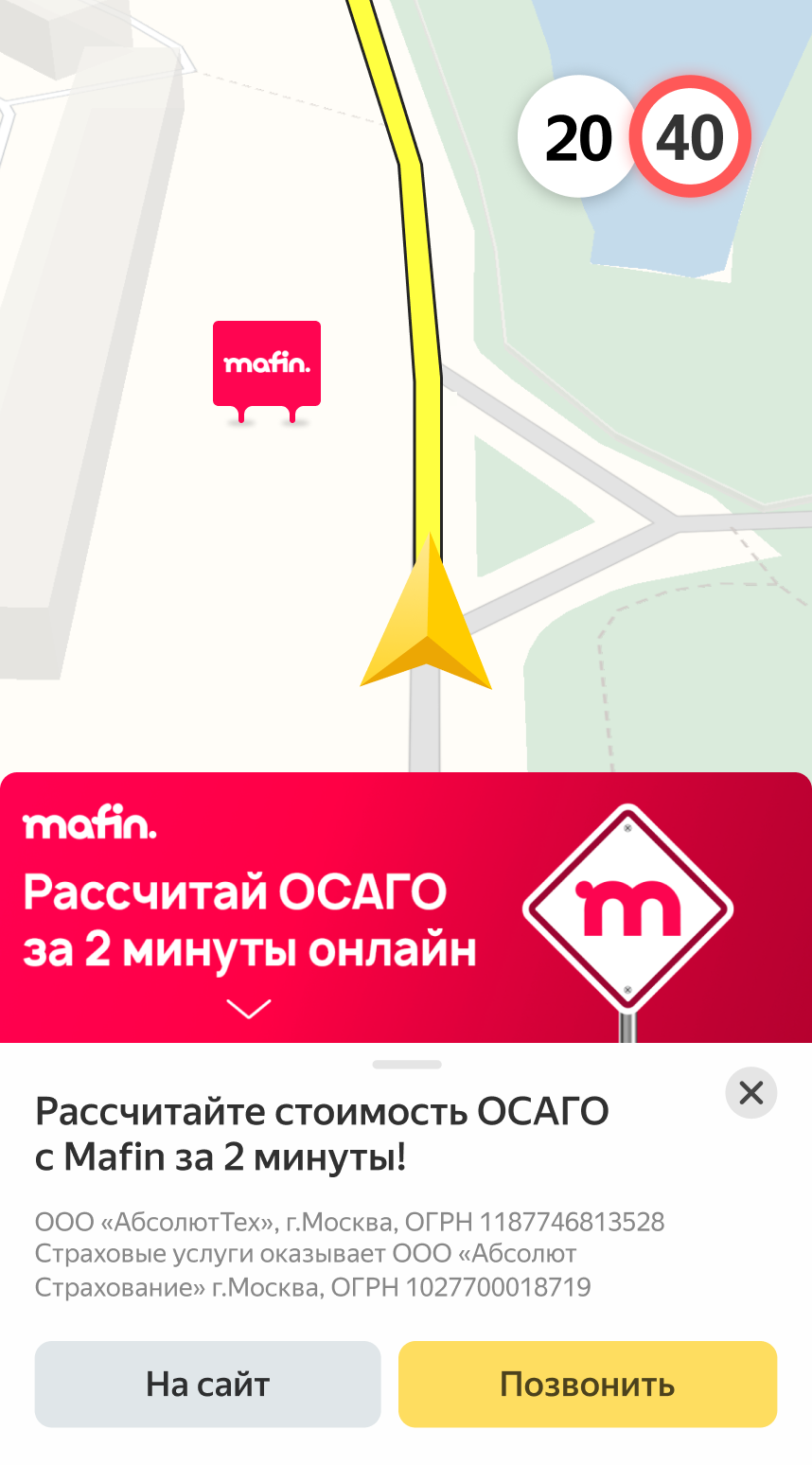 Mafin — сервис онлайн-страхования. Его особенность заключается в глубоком анализе характеристик водителя, которые влияют на итоговую стоимость полиса. Mafin вышел на рынок летом 2019 года и на момент старта кампании (ноябрь 2019) был новым брендом в сегменте автострахования. Запуская кампанию в «Навигаторе», команда Mafin ставила две задачи: сформировать знание о бренде среди пользователей приложения, а также подробнее рассказать о своих продуктах — полисах КАСКО и ОСАГО, которые можно рассчитать и купить онлайн.
