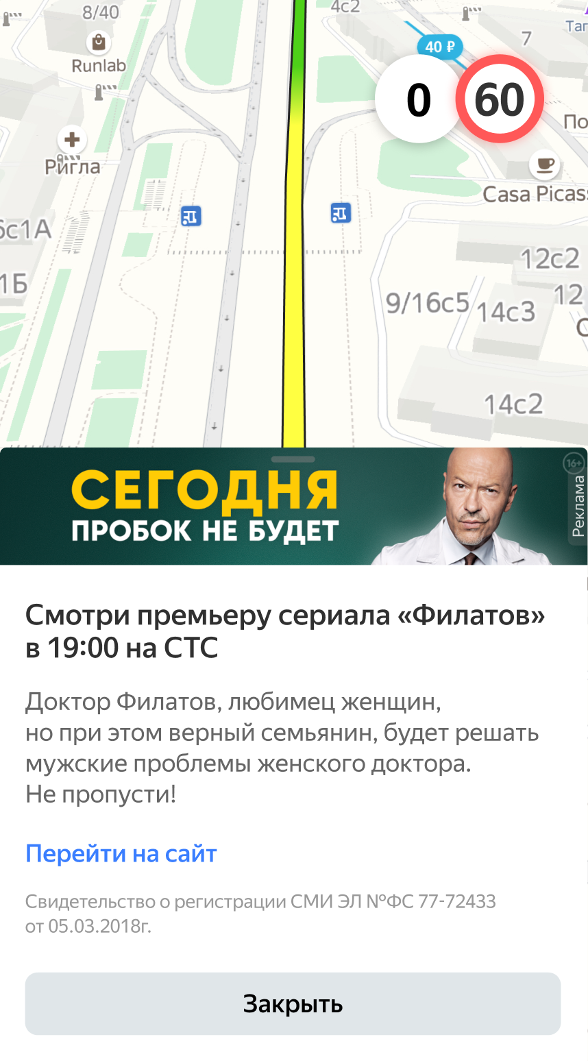 Сегодня телекомпании активно закупают диджитал-рекламу, чтобы вовлечь новую аудиторию в свои проекты. Так, в течение трех месяцев телеканал СТС поддерживал несколько своих проектов с помощью медийных форматов в «Навигаторе». Для анонсирования нового сезона сериала «Кухня» и премьеры сериала «Филатов» СТС выбрал формат баннеров по маршруту. Перед телеканалом стояла задача создать широкий охват и вовлечь пользователей. Кампанию таргетировали на Москву, женщин 35-45 лет — целевую аудиторию проектов. Сериалы в «Навигаторе» анонсировали за 4-5 дней до премьеры и в сам день премьеры.