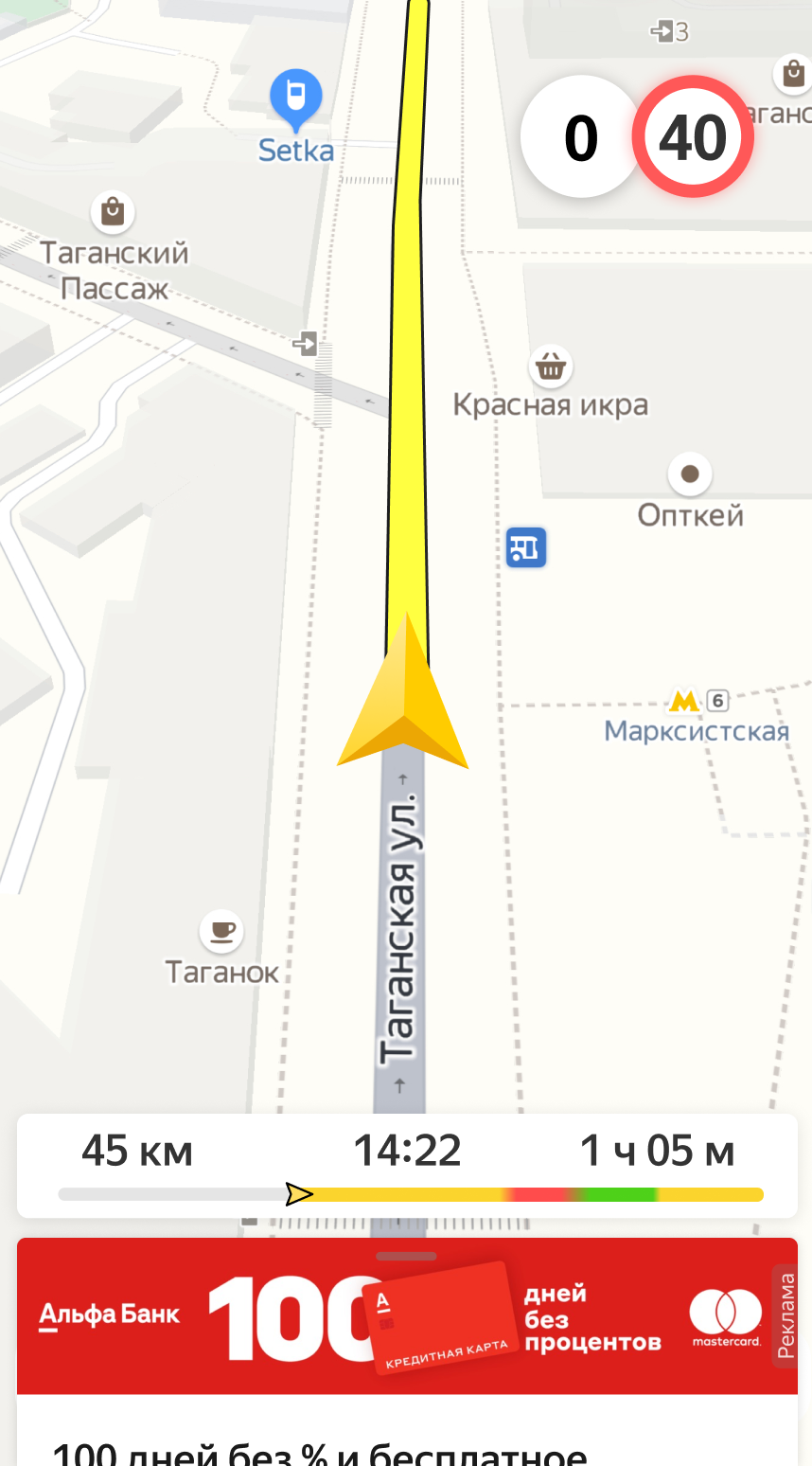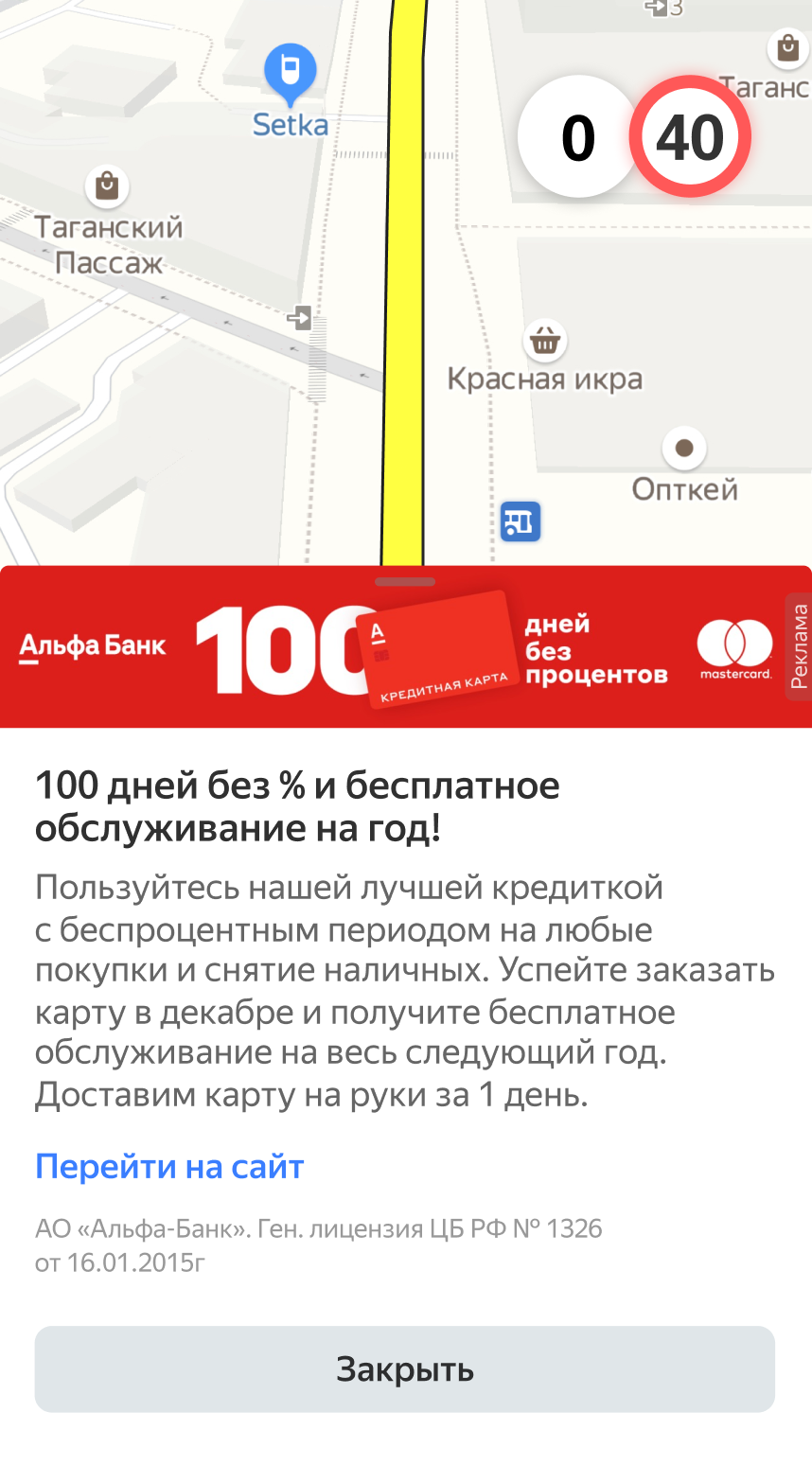 В рекламной кампании кредитной карты «100 дней без процентов» мы искали дополнительную точку контакта в период, когда москвичи много времени проводят за рулем. Многие из них контактировали с нашей рекламой на ТВ и радио, а баннер в «Навигаторе» стал дополнительным напоминанием об акции.