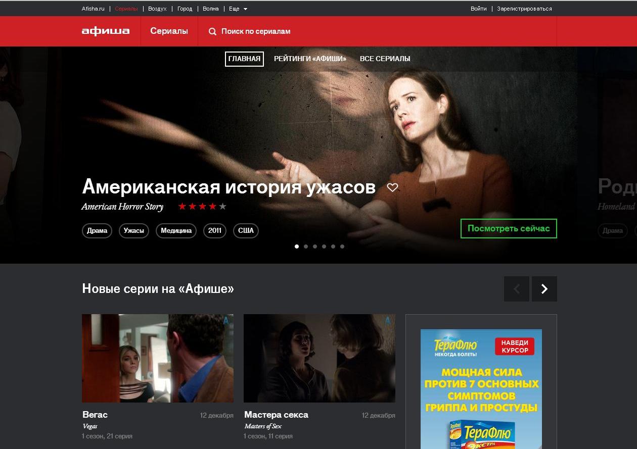 Медиапроект «Афиша» (холдинг «Афиша-Рамблер-SUP») открыл онлайн-кинотеатр «Афиша-Сериалы», о запуске которого в начале декабря 2013 года сообщал директор по продуктам «Афиши» Илья Красильщик. Для просмотра стали доступны российские и зарубежные сериалы от поставщиков видеоконтента «Амедиатека», Megogo, Tvigle.ru, Ivi, Now и Zoomby.