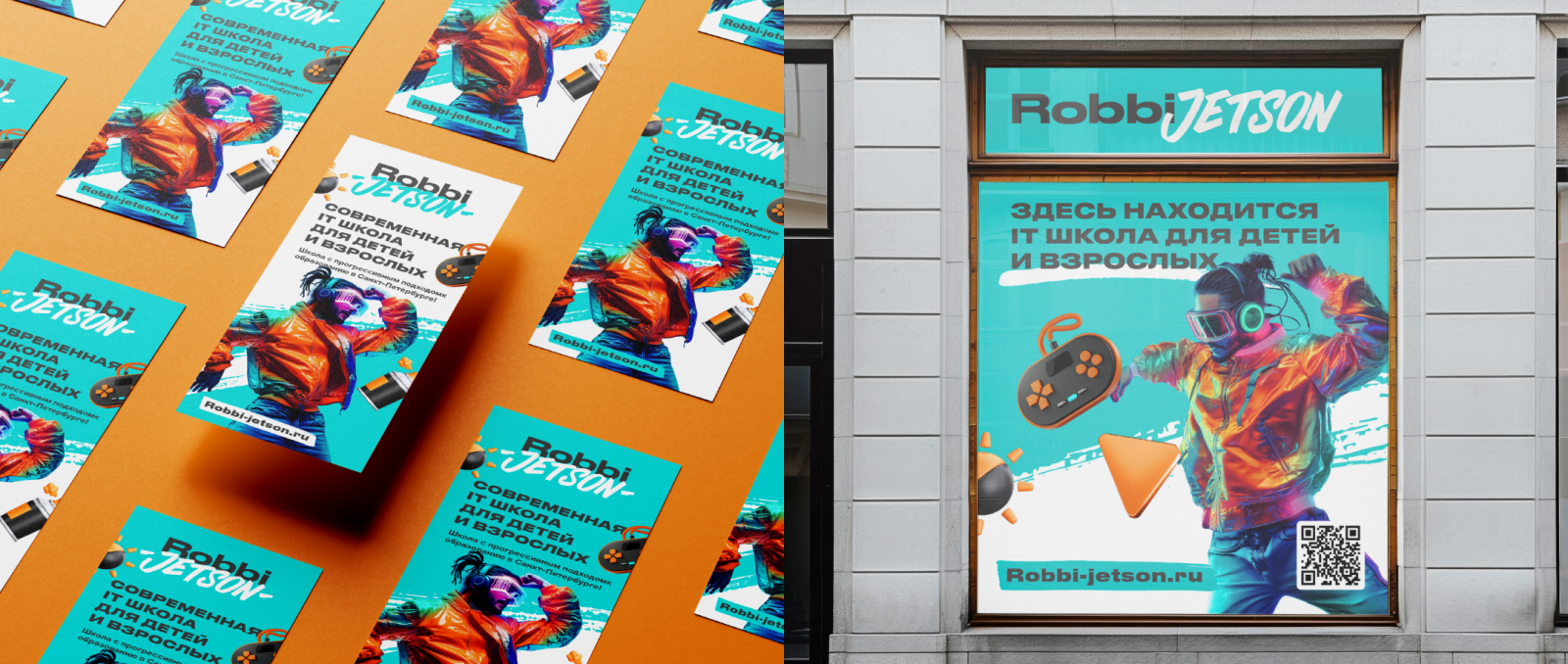 Так как Robbi Jetson — это новый бренд на рынке, нужно было разработать яркое, заметное, интригующее решение, которое привлечет внимание. Тут важен формат учебного заведения — это офлайн-школа. А это значит, что разработанный креатив должен легко адаптироваться для наружной рекламы в прилегающих к школе районах. Реклама должна быть заметной и привлекать внимание аудитории — родителей, бабушек и дедушек, а также и самих ребят. У нас получился классный персонаж, который хорошо выделяется в наружке, особенно в сочетании с ярким бирюзовым фоном.