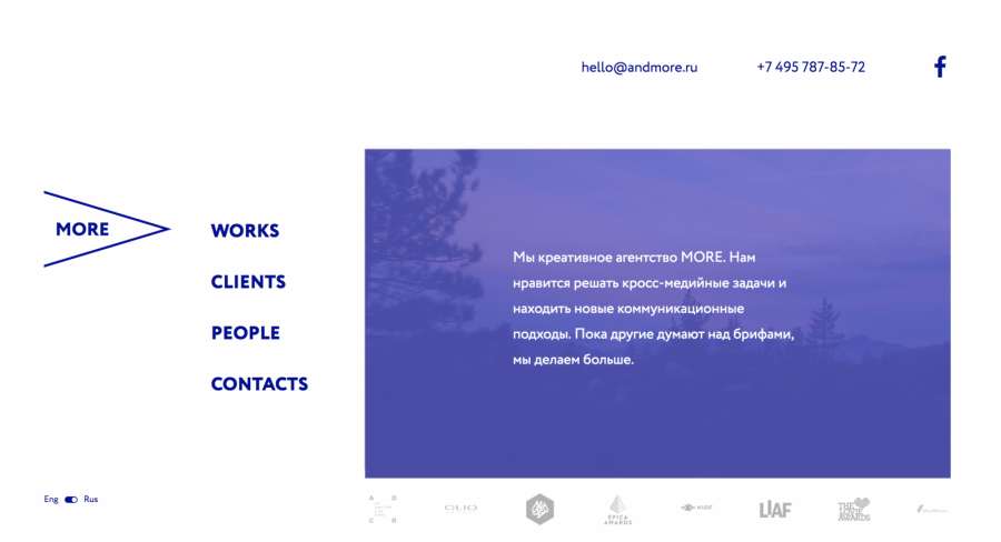 На новом сайте агентства логотип превратился в подвижную стрелку, которая раскрывает пользователю тот или иной раздел, предлагая открыть «more works», «more people», «more clients» и так далее.