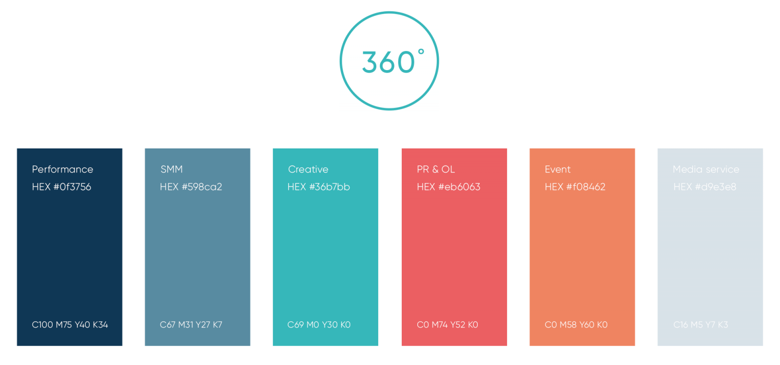Новая цветовая палитра подчеркивает интегрированный подход к коммуникации и отражает шесть направлений агентства: PR и маркетинг влияния, Медиасервис и исследования, Организация мероприятий, Performance-маркетинг, SMM и Креатив. Кроме того, новые цвета позволяют подбирать всевозможные сочетания с учетом специфики того или иного проекта.