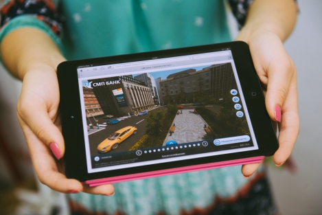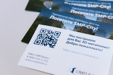 В основу проекта положена идея масштабности и высокого роста показателей банка за отчетный год. Это нашло отражение в концепции 3D-мегаполиса СМП Банка. На улицы, здания, автобусные остановки спроецированы кликабельные графические элементы, содержащие показатели банка. Каждая улица связана с определенным разделом годового отчета, внутри переулков расположились отчетные показатели.