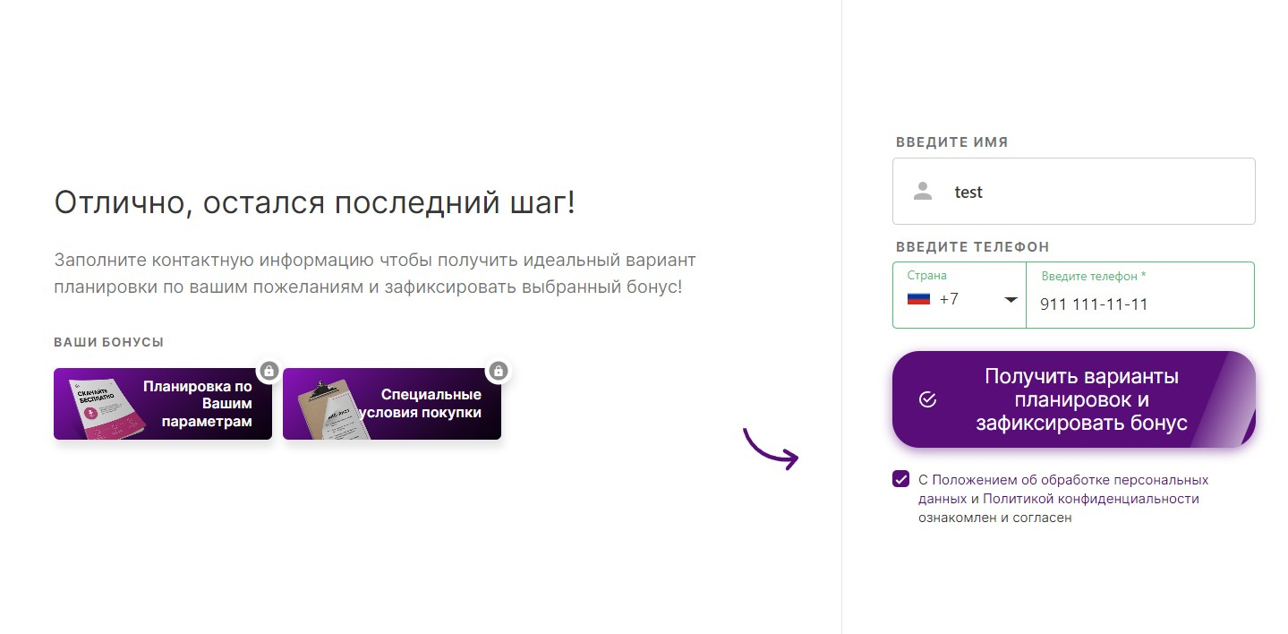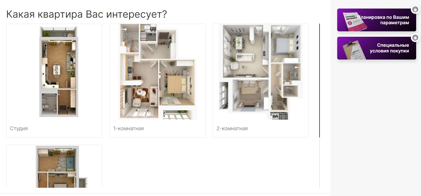 - Добавление дополнительного вопроса, помогающего подсветить целевой аудитории наиболее привлекательные офферы: низкая ипотечная ставка, скидки и специальные условия на покупку некоторых квартир.