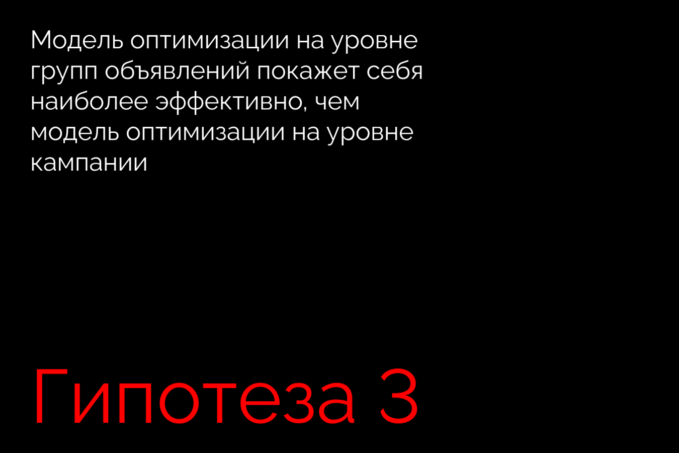 Гипотеза № 3. Модель оптимизации на уровне групп объявлений покажет себя наиболее эффективно, чем модель оптимизации на уровне кампании, потому что даст «раскрутиться» узким целевым таргетингам с небольшим охватом и позволит принести лиды по более низкой цене, рассказывает команда AGM.