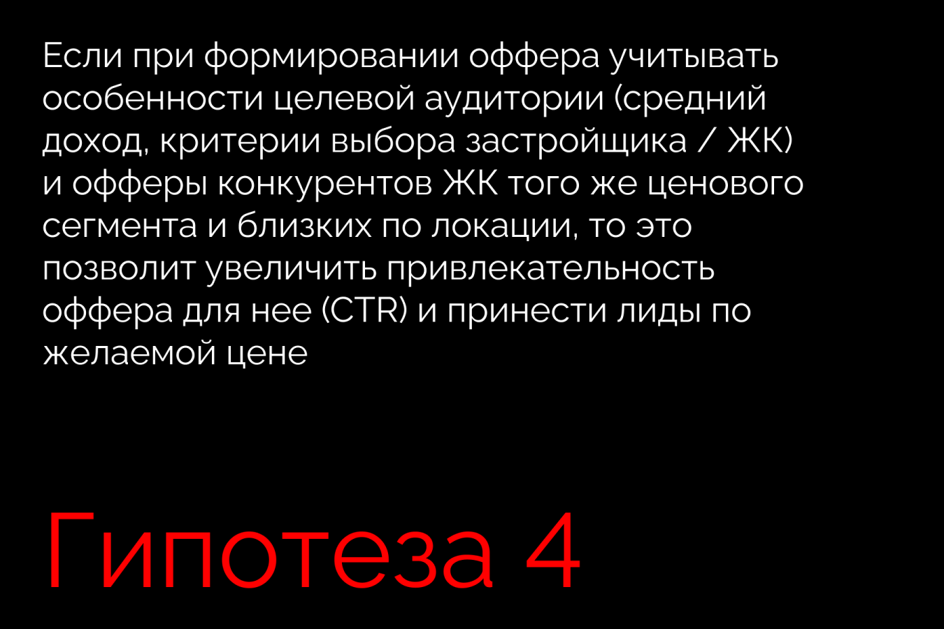 Гипотеза № 4. Если при формировании оффера учитывать особенности целевой аудитории, — средний доход, критерии выбора застройщика или ЖК, — и офферы конкурентов ЖК того же ценового сегмента, то есть в рамках комфорта, и близких по локации, то это позволит увеличить привлекательность оффера для неё (CTR) и принести лиды по желаемой цене — не более 3,5 тыс. руб., объясняют специалисты.