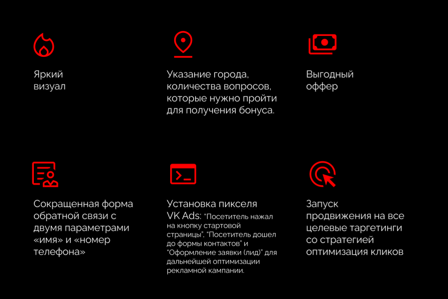 - Установка на квиз пикселя VK Ads с созданием трёх событий: «Посетитель нажал на кнопку стартовой страницы», «Посетитель дошёл до формы контактов» и «Оформление заявки» (лид) для дальнейшей оптимизации рекламной кампании.