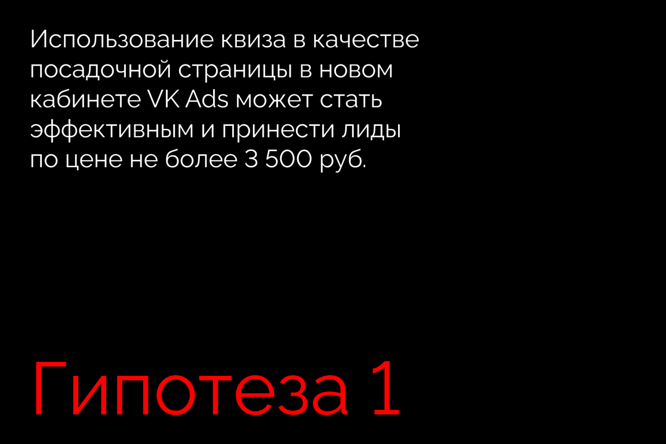 Гипотеза № 1. Использование квиза в качестве посадочной страницы в новом кабинете VK Ads может стать эффективным и принести лиды по цене не более 3,5 тыс. руб., отмечает команда проекта. Это происходит за счёт следующих факторов: