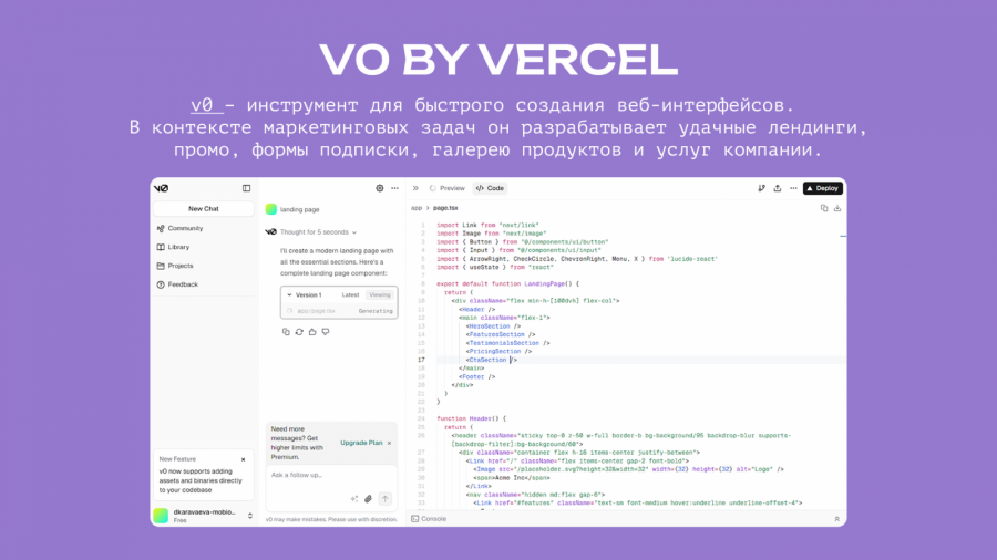 v0 — инструмент для быстрого создания веб-интерфейсов. В контексте маркетинговых задач он разрабатывает удачные лендинги, промо, формы подписки, галерею продуктов и услуг компании.