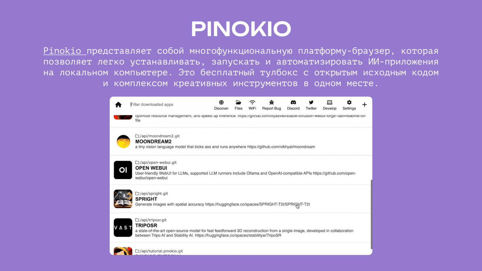 - Один тулбокс. После установки одной платформы пользователю становится доступна целая масса креативных инструментов и приложений с GitHub. Все это работает на Mac и Windows и делает Pinokio инструментом для различных маркетинговых задач. Порог вхождения достаточно низкий — здесь не нужно быть экспертом, чтобы разобраться в установке.